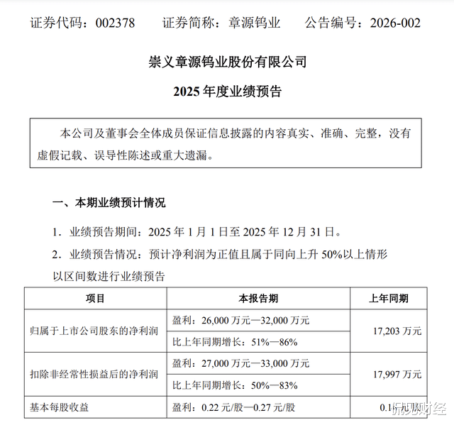{jz:field.toptypename/}把柄此前清楚的功绩预报透露,2025年章源钨业净利润为2.6亿元至3.2亿元,同比增长51%至86%,上年同期为1.72亿元;扣非净利润为2.7亿元至3.3亿元,同比增长50%至83%。